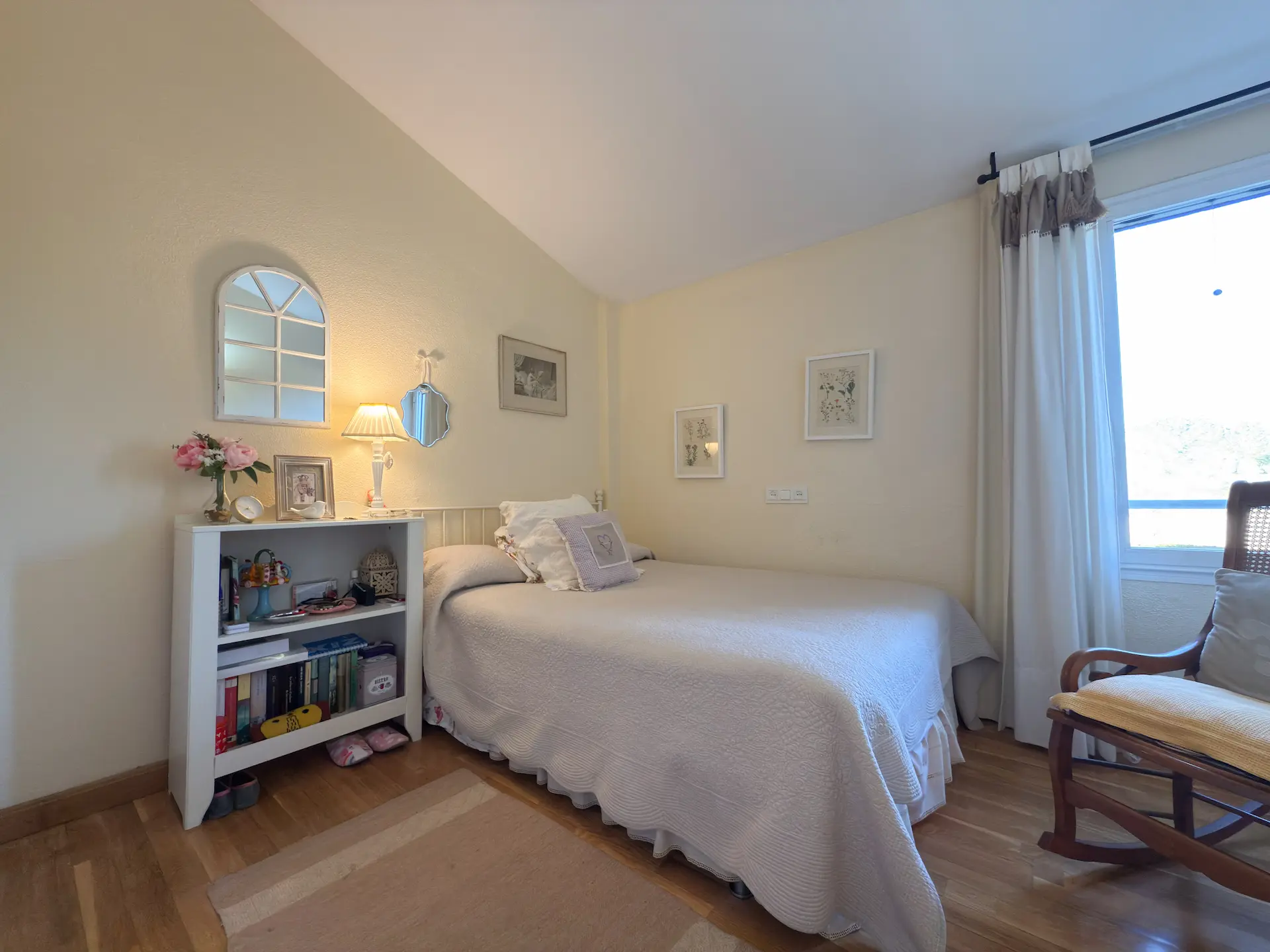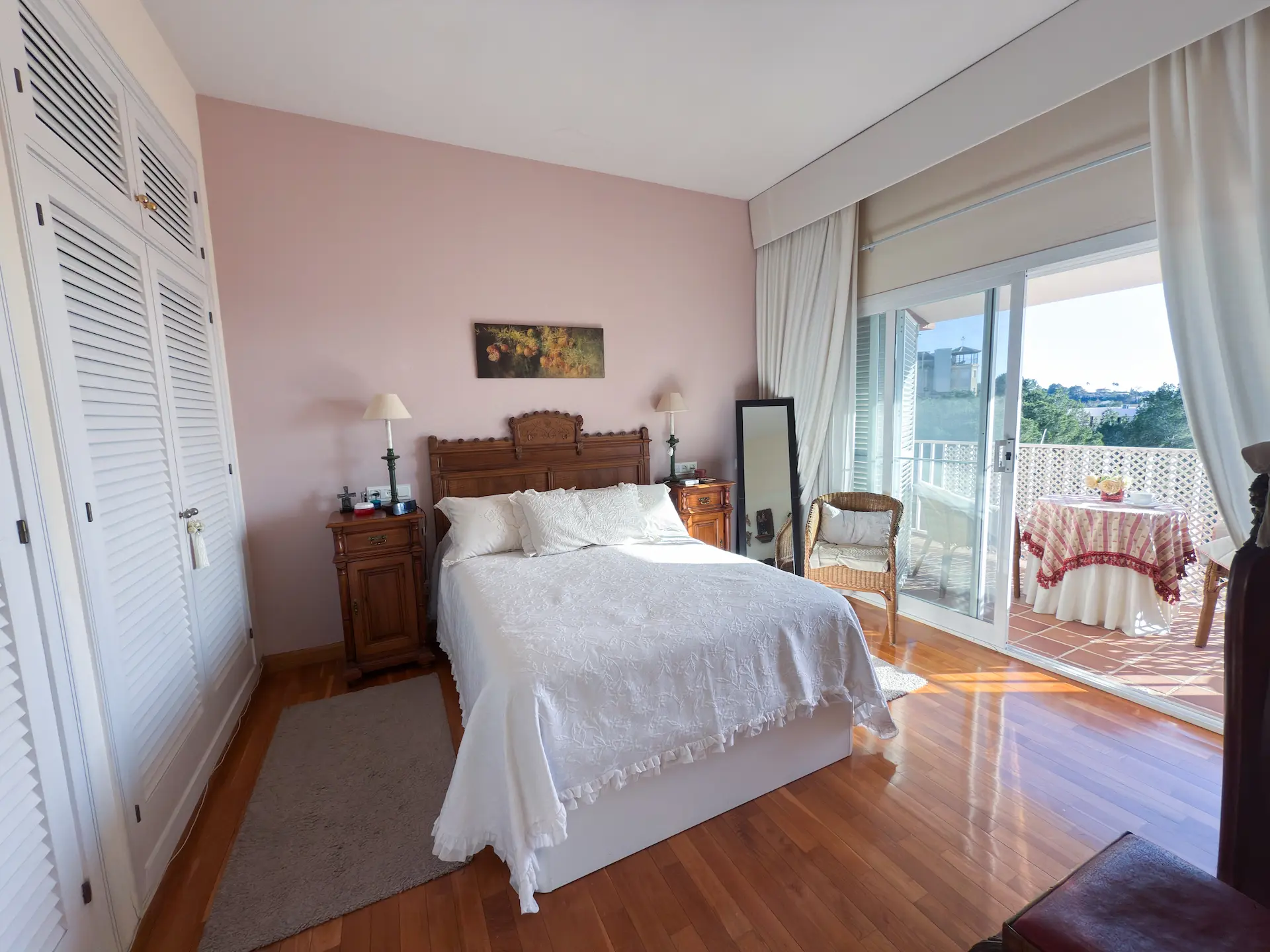 Pasando a la planta de arriba, encontramos una distribución prácticamente simétrica en forma de H en la que se encuentran 4 amplios dormitorios, todos con enormes y bonitos armarios empotrados. Dos de los cuatro dormitorios tienen la misma orientación que el comedor, sur/mediodía y los otros dos dan justo a la otra parte, todos con vistas a la naturaleza. En la parte central de la H, se encuentra el baño completo, quedando los dormitorios de lado y lado totalmente aislados creando así un ambiente de descanso y relax. Destacamos la maravillosa terraza con la que cuenta el dormitorio principal con una acogedora mesa de desayuno para disfrutar del amanecer y de los primeros rayos de sol. El dormitorio principal cuenta también con baño en suite.